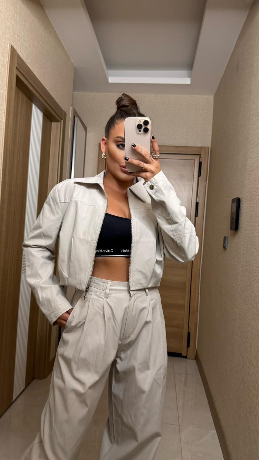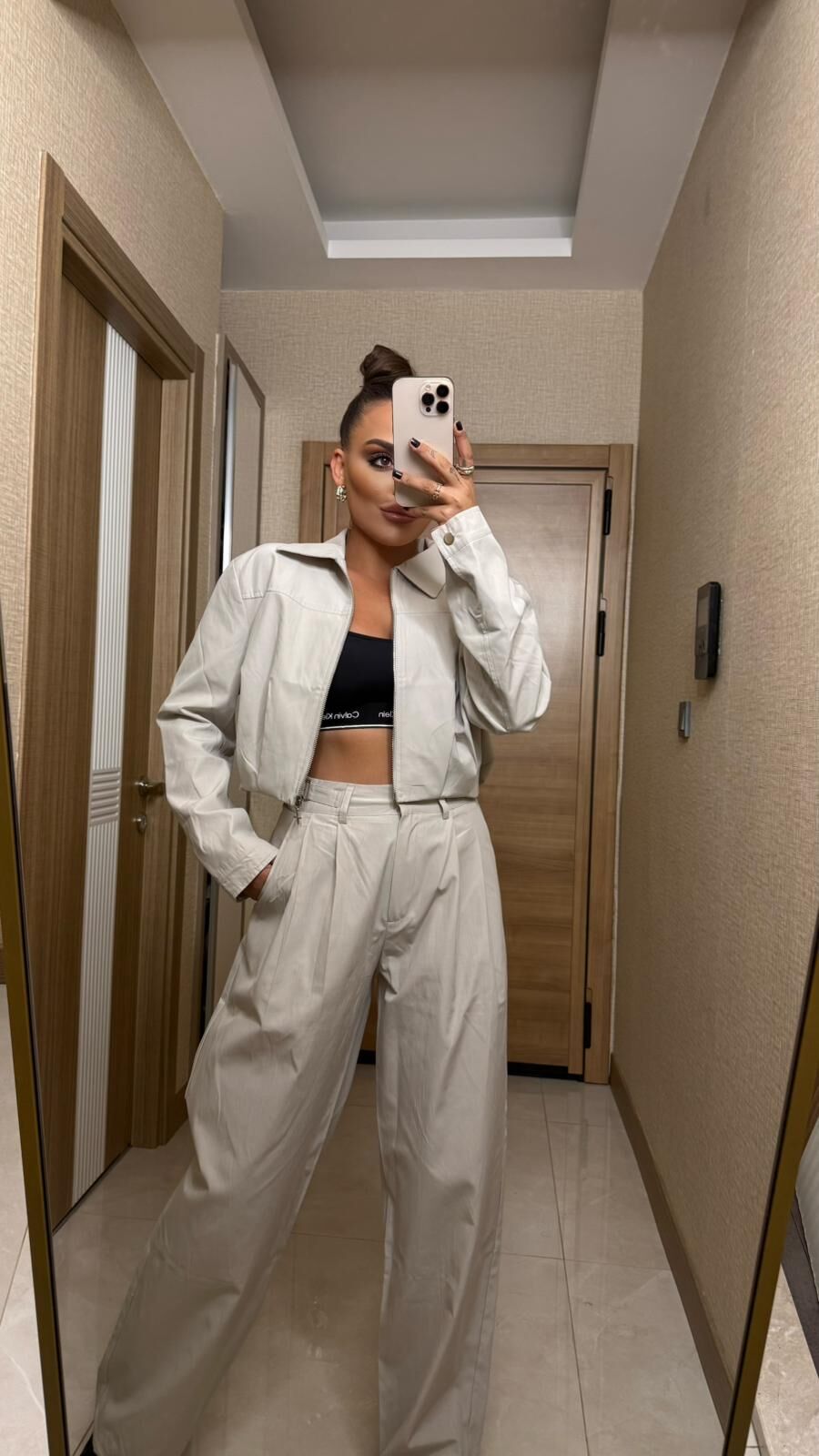 Krem rengi fermuarlı ceket ve pantolon takımı, şıklığı ve rahatlığı bir arada sunar. Kaliteli kumaşıyla günlük kullanıma uygun, modern ve zarif bir seçimdir. Spor ve casual stiller için ideal olan bu takım, özgün tasarımıyla gardırobunuzun vazgeçilmezi olacak.